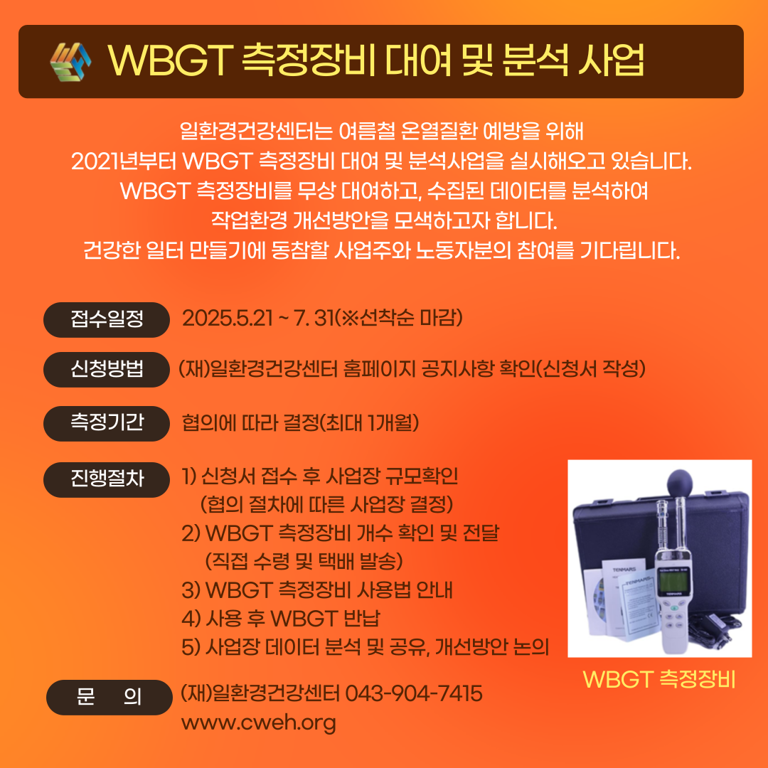 Àç´Ü¹ýÀÎ ÀÏȯ°æ°Ç°¼¾ÅͰ¡ ¿©¸§Ã¶ ¿Â¿Áúȯ ¿¹¹æÀ» À§ÇØ¡¸WBGT(½À±¸È汸¿ÂµµÁö¼ö) ÃøÁ¤ Àåºñ ´ë¿© ¹× ºÐ¼®»ç¾÷¡¹À» ÁøÇàÇÕ´Ï´Ù.