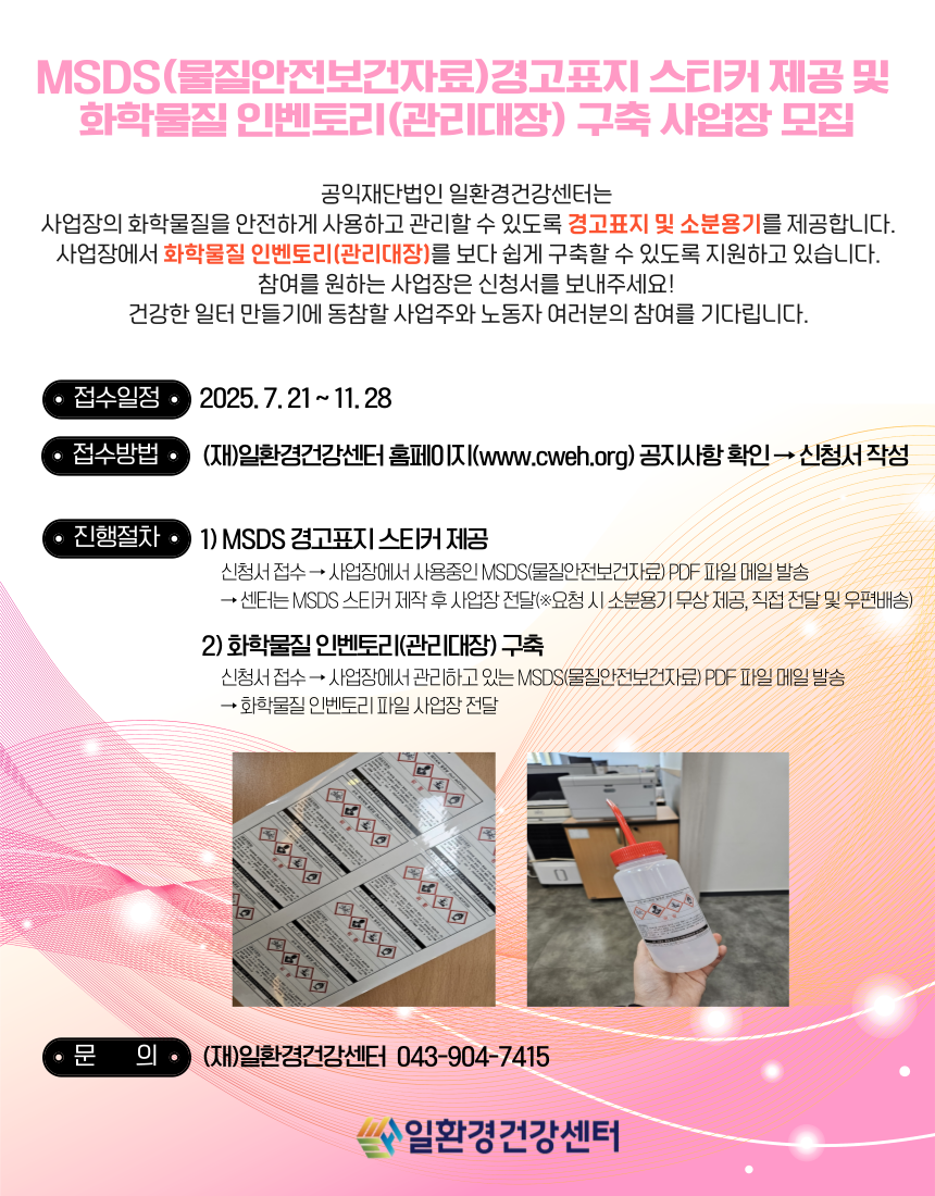 »ç¾÷ÀåÀÇ ÈÇй°ÁúÀ» ¾ÈÀüÇÏ°Ô »ç¿ëÇÏ°í °ü¸®ÇÒ ¼ö ÀÖµµ·Ï MSDS(¹°Áú¾ÈÀüº¸°ÇÀÚ·á)°æ°íÇ¥Áö ¹× ¼ÒºÐ¿ë±â¸¦ Á¦°øÇϰí ÀÖ½À´Ï´Ù.