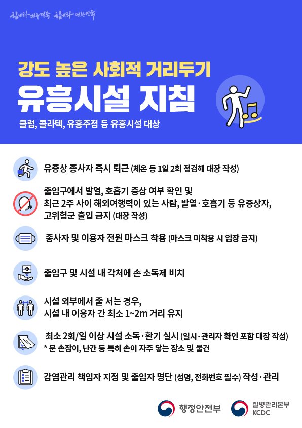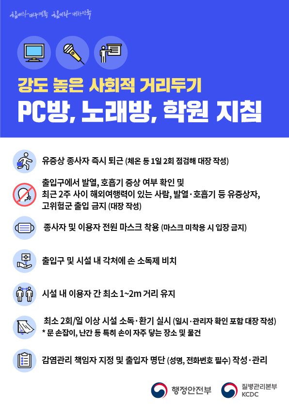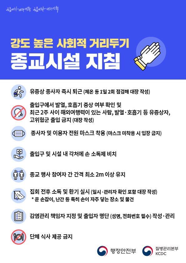 Äڷγª19 Áß¾ÓÀç³¾ÈÀü´ëÃ¥º»ºÎ(Áߴ뺻)°¡ 2020³â 3¿ù 21ÀÏ Äڷγª19 È®»êÀ» ¾ïÁ¦Çϱâ À§ÇØ Á¾±³½Ã¼³, ½Ç³» üÀ°½Ã¼³, À¯Èï½Ã¼³Àº ¾ÕÀ¸·Î 15Àϰ£ ¿î¿µÀ» Áß´ÜÇØ´Þ¶ó°í ±Ç°íÇß´Ù. ¶ÇÇÑ ±¹¹Îµé¿¡°Ôµµ ¸ðÀÓ¡¤¿Ü½Ä¡¤Çà»ç¡¤¿©ÇàÀ» ÃÖ´ëÇÑ ÀÚÁ¦ÇÏ°í »ýÇÊǰ ±¸¸Å³ª ÀÇ·á±â°ü ¹æ¹®, ÃâÅð±Ù ¿Ü¿¡´Â ¿ÜÃâÀ» ÀÚÁ¦ÇØ´Þ¶ó°í ´çºÎÇß´Ù. Á¤ºÎÀÇ À̹ø ¹æÄ§Àº °³ÇÐ ½ÃÁ¡ ÀÌÀü±îÁö °µµ ³ôÀº »çȸÀû °Å¸®µÎ±â¸¦ ÅëÇØ °¨¿°º´ ÀüÆÄ¸¦ Â÷´ÜÇϰڴٴ ¸ñÇ¥¸¦ ´ã°í ÀÖ´Ù.