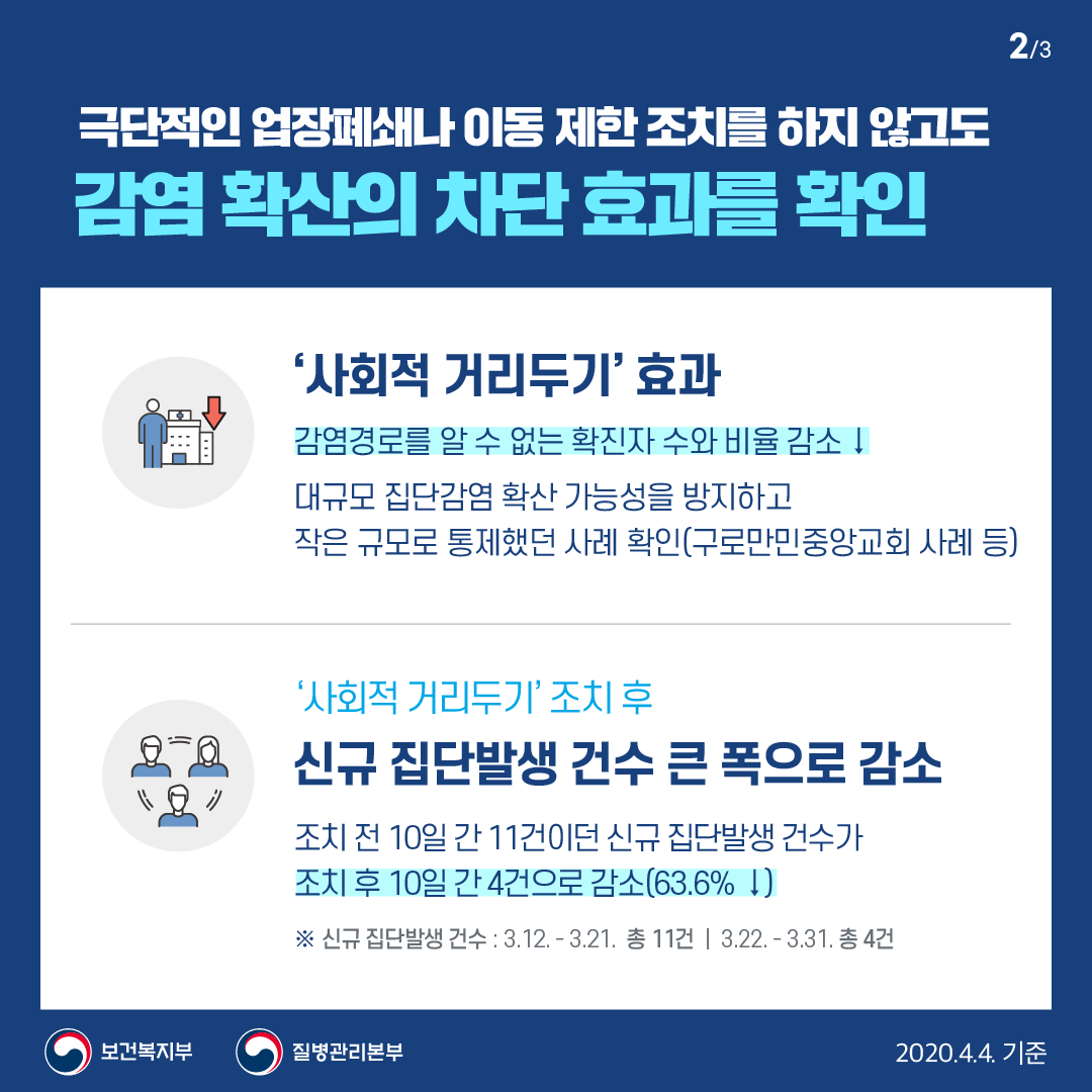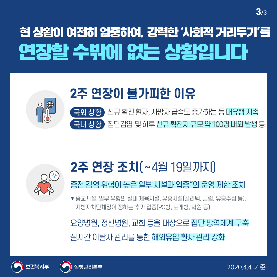 ¶ÇÇÑ Á¤ºÎ´Â Àü ¼¼°èÀûÀ¸·Î Äڷγª19 ½Å±Ô È®Áø ȯÀÚ¿Í »ç¸ÁÀÚ°¡ ±Þ¼Óµµ·Î Áõ°¡ÇÏ´Â µî ´ëÀ¯ÇàÀÌ °è¼ÓµÇ°í, ±¹³»¿¡¼´Â ¿©ÀüÈ÷ Áý´Ü°¨¿°ÀÌ ¹ß»ýÇϰí ÇÏ·ç ½Å±Ô È®ÁøÀÚ ±Ô¸ðµµ ¾à 100¸í ³»¿Ü¿¡¼ ÁÙÁö ¾Ê´Â Çö »óȲÀÌ ¿©ÀüÈ÷ ¾öÁßÇÏ´Ù°í ÆÇ´ÜÇÏ¿© °·ÂÇÑ »çȸÀû °Å¸®µÎ±â¸¦ 4¿ù 19ÀϱîÁö 2ÁÖ ¿¬ÀåÇÑ´Ù°í 4¿ù 4ÀÏ ¹ßÇ¥Çß´Ù.