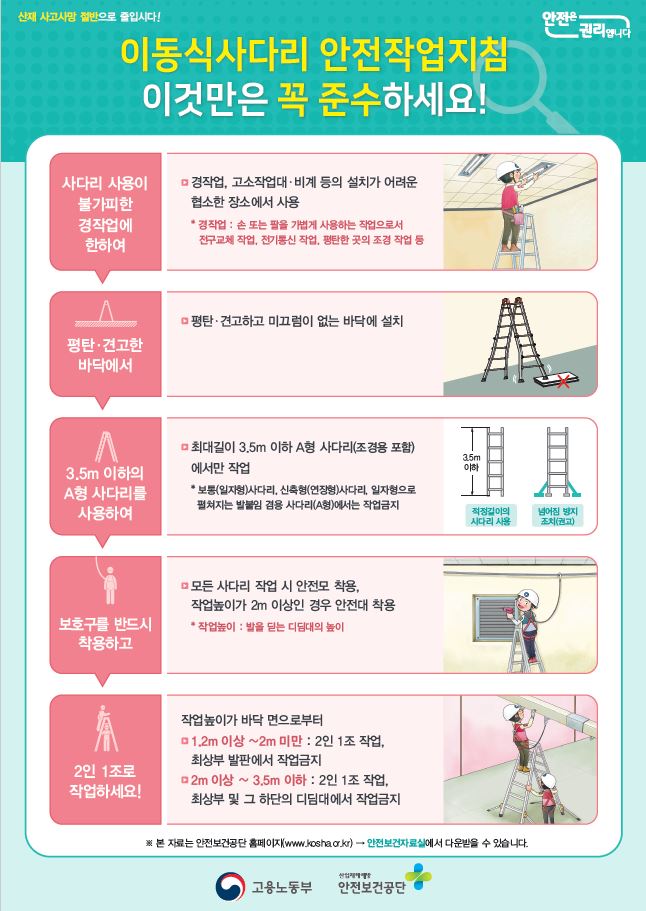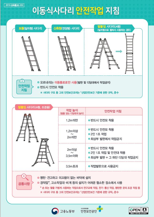 1. »ç´Ù¸® »ç¿ëÀÌ ºÒ°¡ÇÇÇÑ °æÀÛ¾÷¿¡ ÇÑÇÏ¿©! ¢Ñ °æÀÛ¾÷*, °í¼ÒÀÛ¾÷´ë¡¤ºñ°è µîÀÇ ¼³Ä¡°¡ ¾î·Á¿î Çù¼ÒÇÑ Àå¼Ò¿¡¼ »ç¿ë * °æÀÛ¾÷ : ¼Õ ¶Ç´Â ÆÈÀ» °¡º±°Ô »ç¿ëÇÏ´Â ÀÛ¾÷ (¿¹: Àü±¸±³Ã¼ÀÛ¾÷, Àü±âÅë½ÅÀÛ¾÷, ÆòźÇÑ °÷ÀÇ Á¶°æÀÛ¾÷ µî)2. ÆòźÇÏ°í °ß°íÇÏ°í ¹Ì²ô·³ÀÌ ¾ø´Â ¹Ù´Ú¿¡¼! 3. ÃÖ´ë±æÀÌ 3.5m ÀÌÇÏÀÇ AÇü »ç´Ù¸®¿¡¼¸¸! ¢Ñ º¸Åë(ÀÏÀÚÇü)»ç´Ù¸®, ½ÅÃàÇü(¿¬ÀåÇü)»ç´Ù¸®, ÀÏÀÚÇüÀ¸·Î ÆîÃÄÁö´Â ¹ßºÙÀÓ °â¿ë »ç´Ù¸®(AÇü)¿¡¼´Â ¹Ýµå½Ã ¾ÈÀü¸ð¸¦ Âø¿ëÇÑ »óÅ¿¡¼ ¿À¸£³»¸®´Â À̵¿Åë·Î·Î¸¸ »ç¿ëÇÒ ¼ö ÀÖÀ¸¸ç, ¹ßÆÇ ¹× µðµõ´ë¿¡¼ ÀÛ¾÷±ÝÁö4. ¸ðµç »ç´Ù¸® ÀÛ¾÷ ½Ã ¾ÈÀü¸ð µî º¸È£±¸¸¦ ¹Ýµå½Ã Âø¿ëÇϰí! ¢Ñ ÀÛ¾÷³ôÀ̰¡ 2m ÀÌ»óÀÎ °æ¿ì ¾ÈÀü´ë Âø¿ë 5. ²À 2ÀÎ 1Á¶·Î ÀÛ¾÷Çϼ¼¿ä! ¢Ñ ¹Ù´Ú¸éÀ¸·ÎºÎÅÍ ÀÛ¾÷³ôÀ̰¡ 1.2m ¹Ì¸¸ : ¹Ýµå½Ã ¾ÈÀü¸ð Âø¿ë ¹Ù´Ú¸éÀ¸·ÎºÎÅÍ ÀÛ¾÷³ôÀ̰¡ 1.2m ÀÌ»ó ~ 2m ¹Ì¸¸ : ¹Ýµå½Ã ¾ÈÀü¸ð Âø¿ë, 2ÀÎ 1Á¶ ÀÛ¾÷, ÃÖ»óºÎ ¹ßÆÇ¿¡¼ ÀÛ¾÷±ÝÁö ¹Ù´Ú¸éÀ¸·ÎºÎÅÍ ÀÛ¾÷³ôÀ̰¡ 2m ÀÌ»ó ~ 3.5m ÀÌÇÏ : ¹Ýµå½Ã ¾ÈÀü¸ð Âø¿ë, 2ÀÎ 1Á¶ ÀÛ¾÷ ¹× ¾ÈÀü´ë Âø¿ë, ÃÖ»óºÎ ¹ßÆÇ ¹× ±× ÇÏ´ÜÀÇ µðµõ´ë¿¡¼ ÀÛ¾÷±ÝÁö ¹Ù´Ú¸éÀ¸·ÎºÎÅÍ ÀÛ¾÷³ôÀ̰¡ 3.5m Ãʰú : ÀÛ¾÷¹ßÆÇÀ¸·Î »ç¿ë±ÝÁö